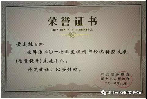 此次入選溫州市2017年度經(jīng)濟轉型發(fā)展質(zhì)量提升先進個人共16人,浙江石化閥門有限公司黃美林當選,充分體現(xiàn)了社會各界對浙江石化閥門質(zhì)量的認可。